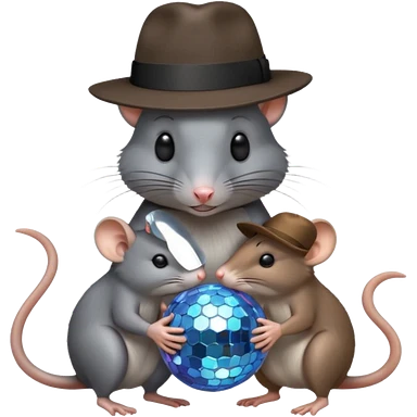 A black rat wearing a fedora standing between two brown rats wearing fedoras holding a disco ball emoji | AI Emoji Generator