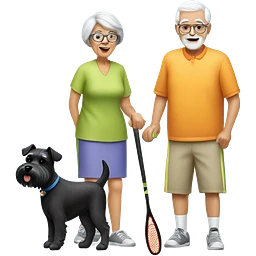 A small grandma with short grey hair and glasses, and a thin grandpa with a short white beard and glasses, playing pickle ball with a small black and white schnauzer emoji