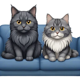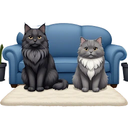 A black smoke Maine Coon cat with long gray ear tufts and a large gray ruff, and a thick blue British Shorthair cat, sitting together on a couch. A cozy room with flowers in the background. Transparent background. emoji | AI Emoji Generator