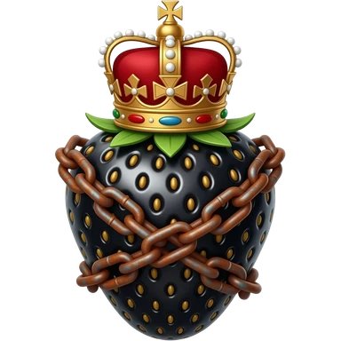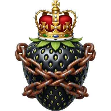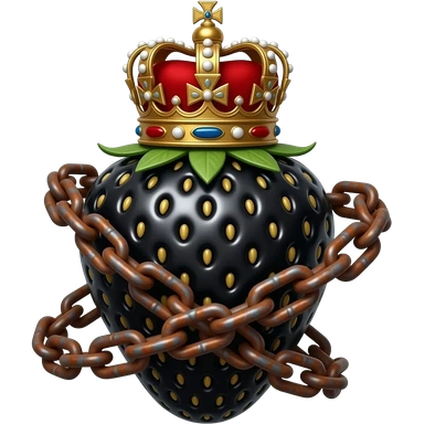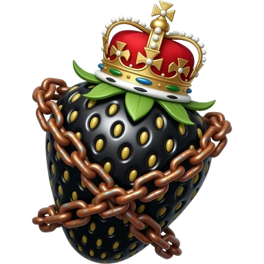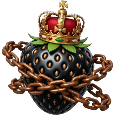 a black strawberry with a rusty, richly decorated English royal crown on top that is flaming. An oversized rusty chain is wrapped around the strawberry's body and is spinning around its body emoji