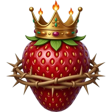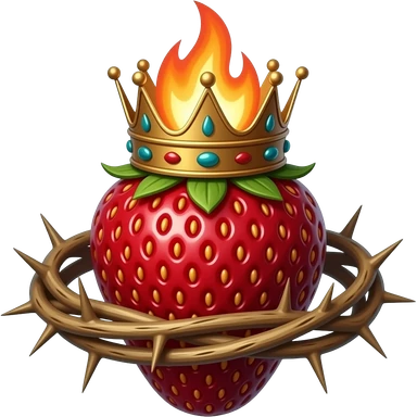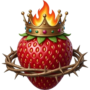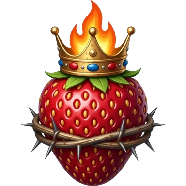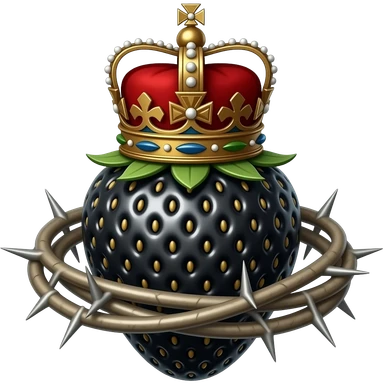 a black strawberry with a rusty, richly decorated English royal crown on top that is flaming. An oversized crown of thorns is wrapped around the strawberry's body and is spinning around its body emoji | AI Emoji Generator