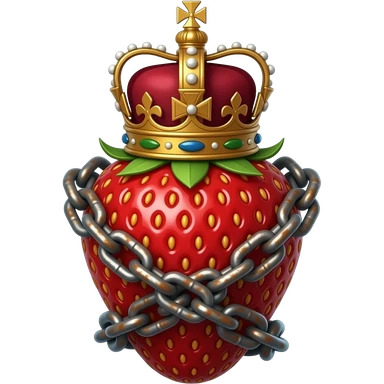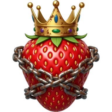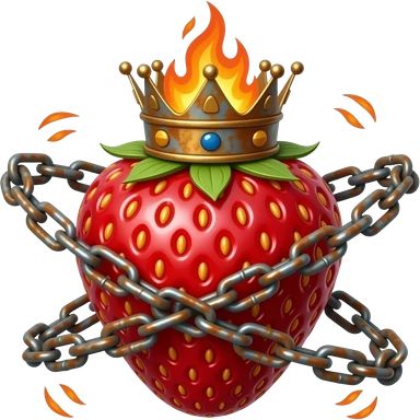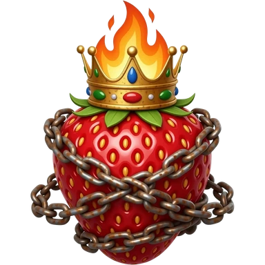 a strawberry made of steel with a rusty, richly decorated English royal crown on top that is flaming. An oversized rusty chain is wrapped around the strawberry's body and is spinning around its body emoji