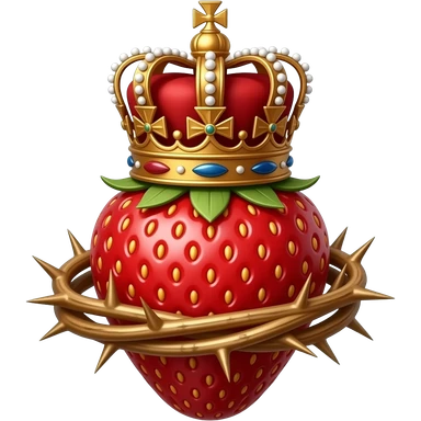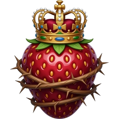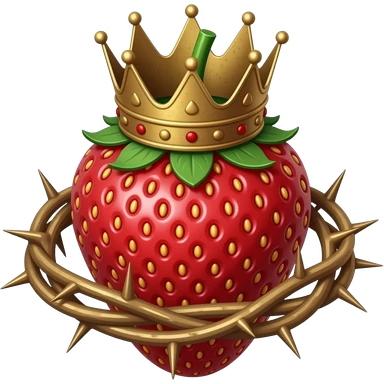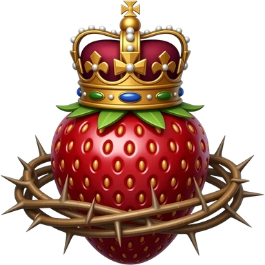 a rusty strawberry with a rusty, richly decorated English royal crown on top. A crown of thorns is wrapped around the strawberry's body and is spinning around its body in the form of an infinity sign emoji