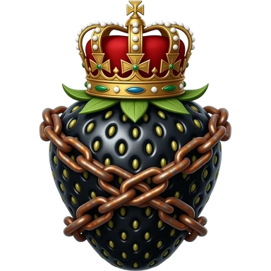 a black strawberry that has a rusty, richly decorated royal crown instead of a stem. A crown of thorns is wrapped around the strawberry's body and a rusty bronze chain is spinning around its body emoji