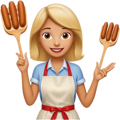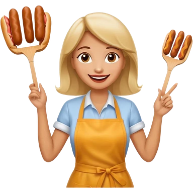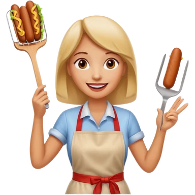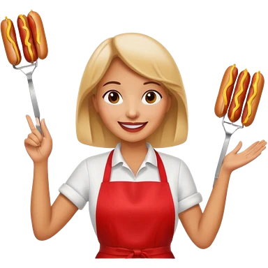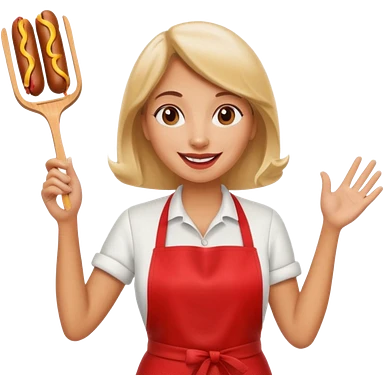 A cheerful woman selling hotdogs, waving a tongs in one hand. emoji