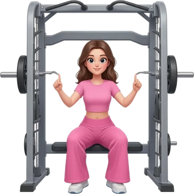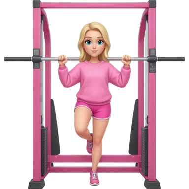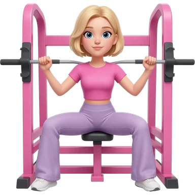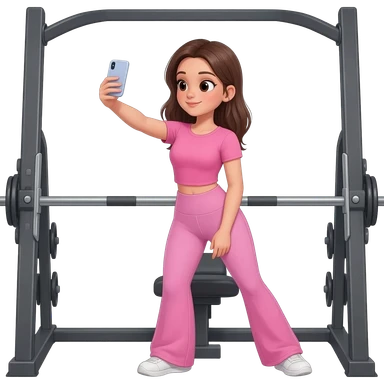 A blond girl wearing a pink workout set which is fitted tshirt pink, and wide leg leggings that are flowy on a hip trust on smith machine that is posing and taking a selfie in the gym emoji | AI Emoji Generator