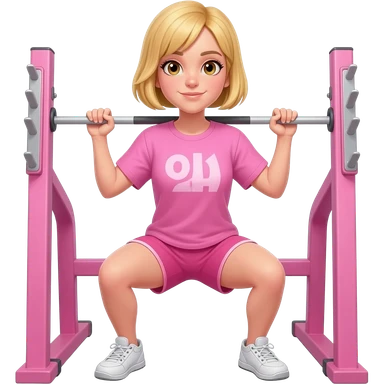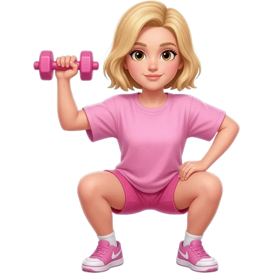 A girl wearing a pink workout set which is big tshirt pink, and pink shorts on a dumbbell squat that is pink the girl is blond emoji