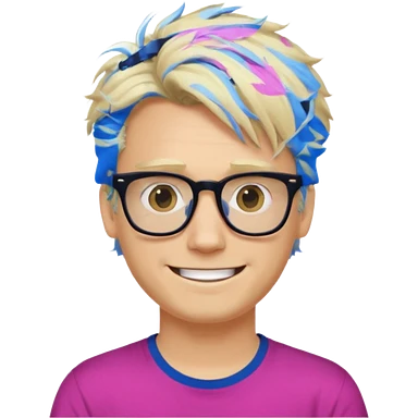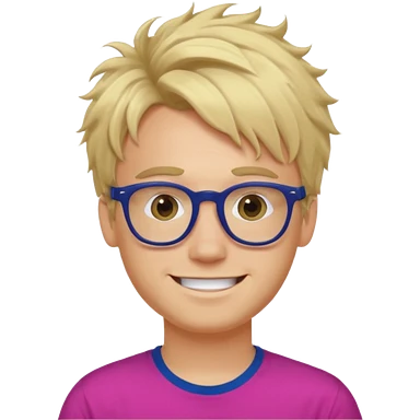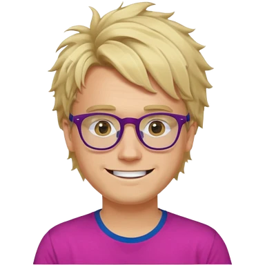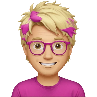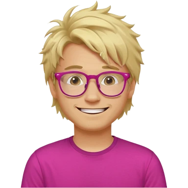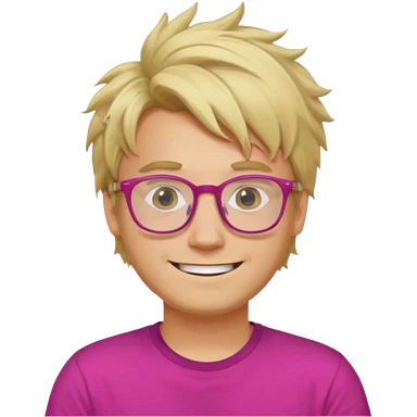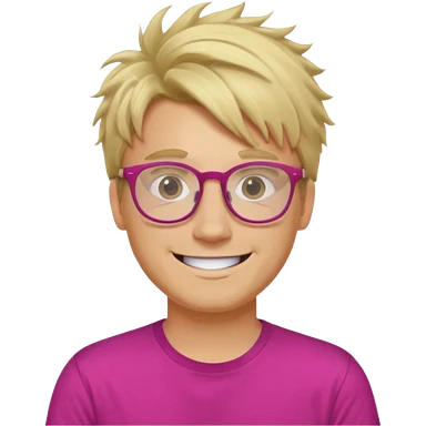 A blond guy with messy hair is smiling. He wear black and dark blue glasses and a fushia T-shirt. emoji | AI Emoji Generator