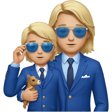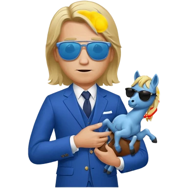 A blond man in a blue suit with a Colt pointing forward. The audience , and long hair and san glasses emoji