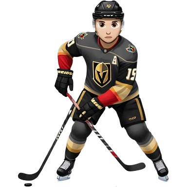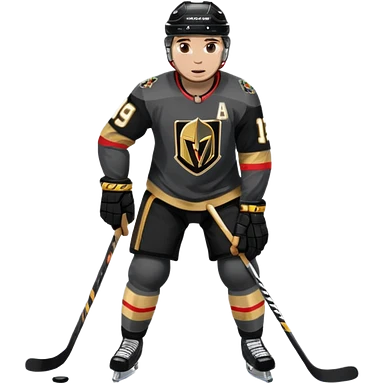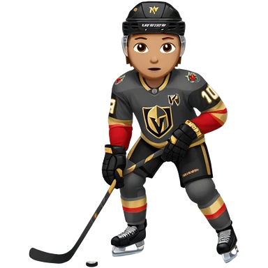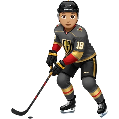 A hockey player in a Vegas Golden Knights black & gold jersey, red accent glow, centered stance, stick on the ice, confident posture. Background subtle red aura with a knight-helmet inspired motif. Clean, bold, emoji-style. emoji