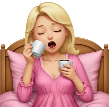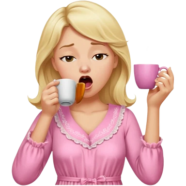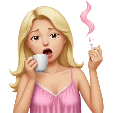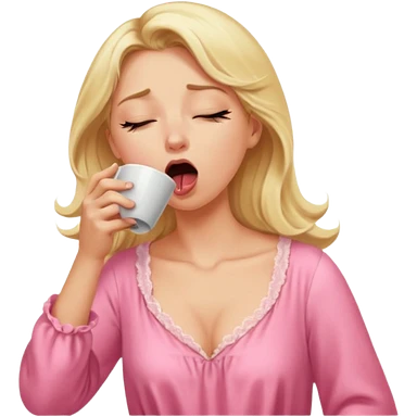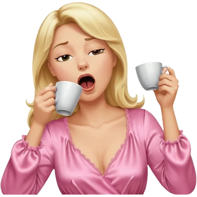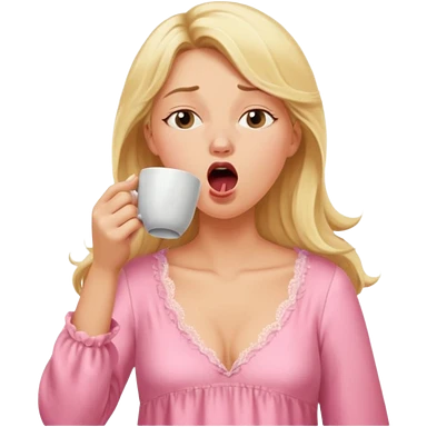 A blonde woman in a pink nightgown yawns, looking sleepy with dark circles under her eyes, drinking coffee, looking like she just woke up. emoji