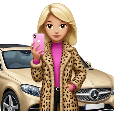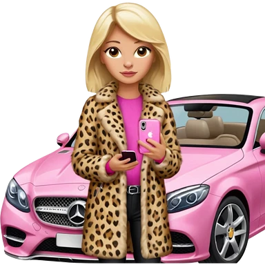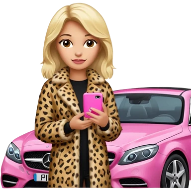 a blondie queen Arina in a leopard fur and pink iPhone on her mercedes emoji