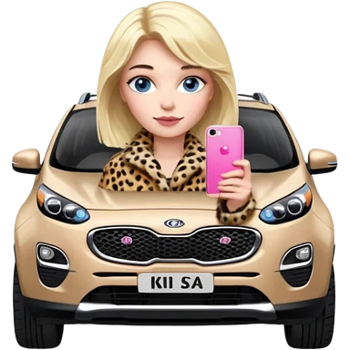 a blondie queen Arina in a leopard fur and pink iPhone 16 on her kia Sportage white car. blue eyes emoji | AI Emoji Generator