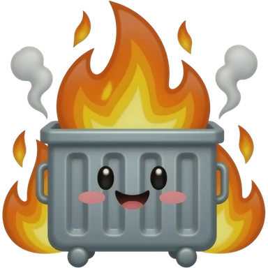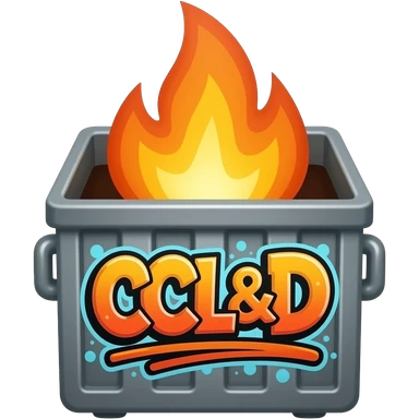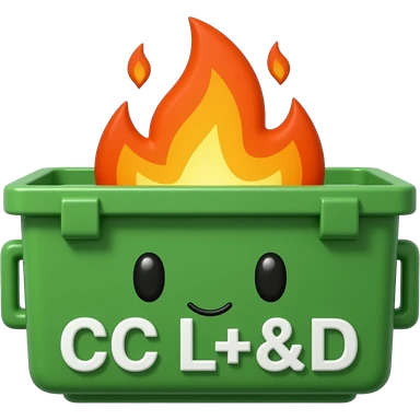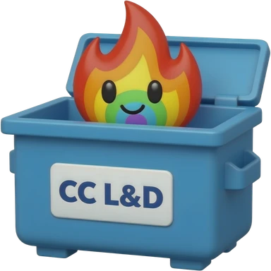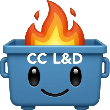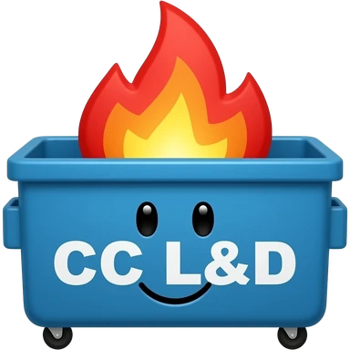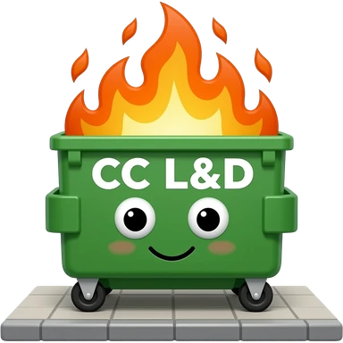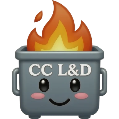 a dumpster fire in the shape of the words CC L&D with a cute face on the front emoji