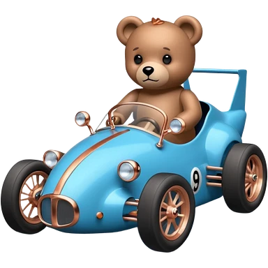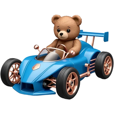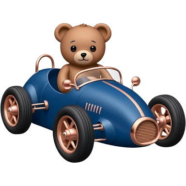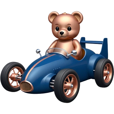 dark blue and rosegold-accented retro racing car driven by a small evil scary teddy bear with rear spoiler and wheely bar emoji
