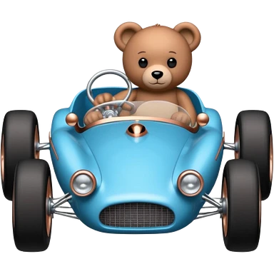 dar crystal blue and rosegold-accented retro racing car driven by a small evil scary teddy bear with rear spoiler, safety cage, and wheely bar emoji