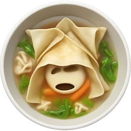 Wenzhou Huntun Wonton Noodle Soup with small dumplings, simplified emoji style with bold outlines and bright colors, cartoon style Zhejiang specialty with clear broth emoji