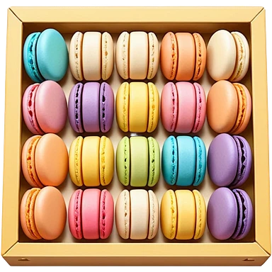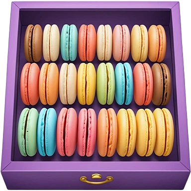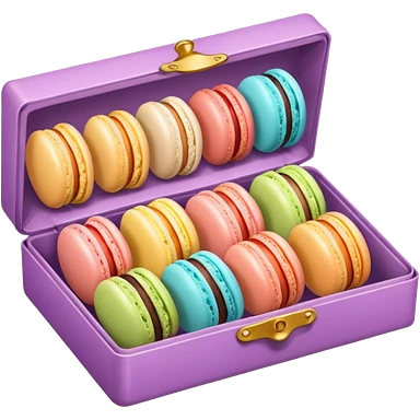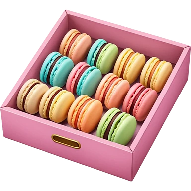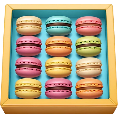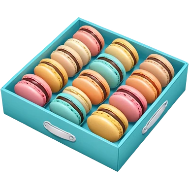Realistic transparent plastic box with a tiffany blue ribbon and bow around the box and pastel macarons inside of it. emoji