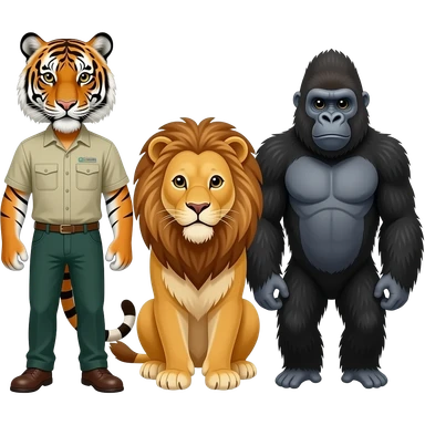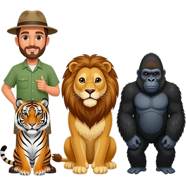 A man zookeeper standing with a tiger, lion and gorilla emoji