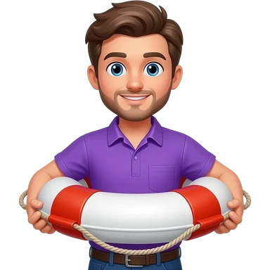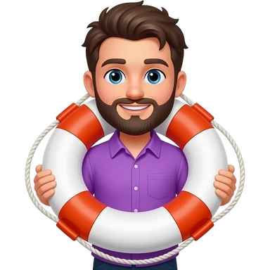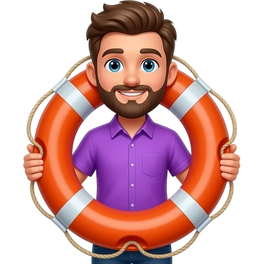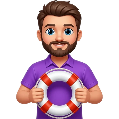 a boy in vibrant purple shirt with beared hold a life preserver with two hands emoji