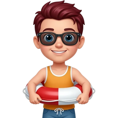 a boy with mehroon hairs and wear sun glasses holding a lifeguard in hands half body close up emoji
