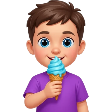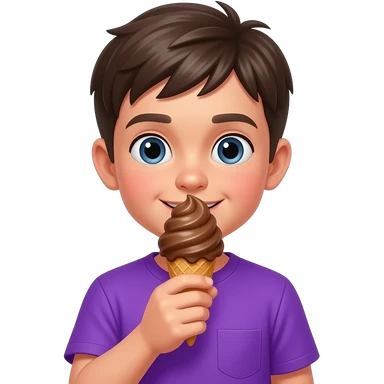 a boy in vibrant purple color shirt holding a ice cream with brown color scope close to mouth emoji