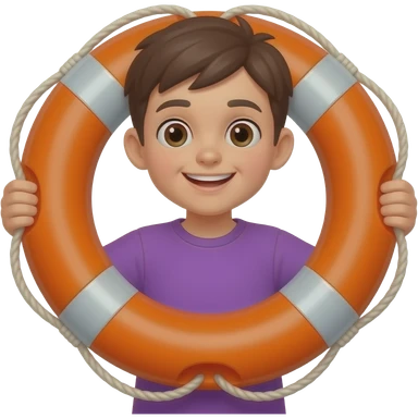 a boy in vibrant purple shirt with beared hold a big size life preserver with two hands emoji