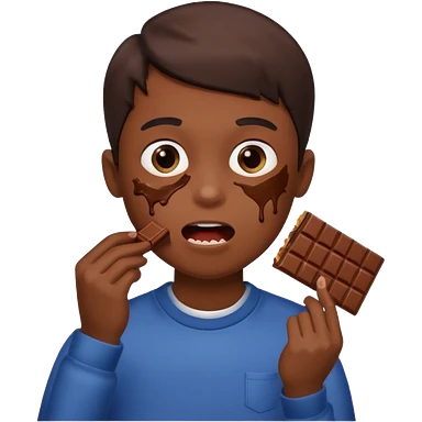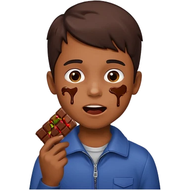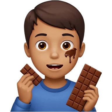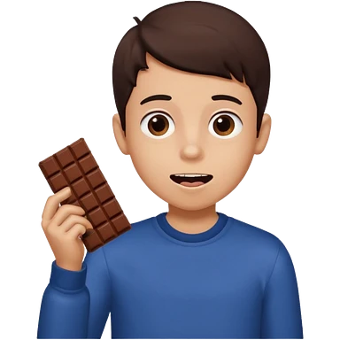 A boy holding a chocolate bar with him chewing on the bite he took emoji | AI Emoji Generator