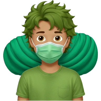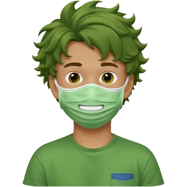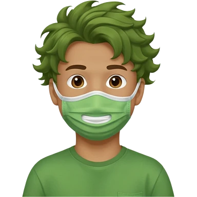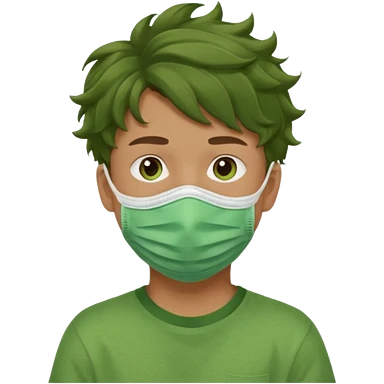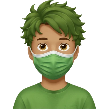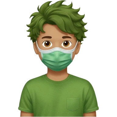 A teenage boy, tanned, wearing a green t-shirt , blue jeans and green sneakers with brown wavy tousled hair, smirking, wearing a green face mask emoji