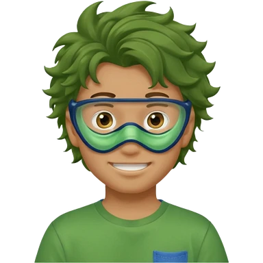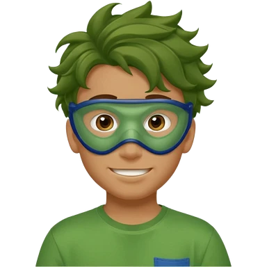 A teenage boy, tanned with glasses, wearing a green t-shirt , blue jeans and green sneakers with brown wavy tousled hair, smirking, wearing a green face mask emoji