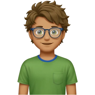 A 14 yerar old teenage boy, slightly tanned, wearing a green tshirt (no shirt pocket), blue jeans and green sneakers with brown tousled hair, smirking emoji