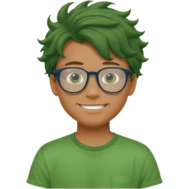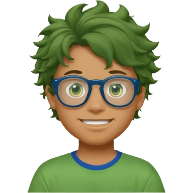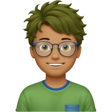 A teenage boy, tanned, wearing a green t-shirt , blue jeans and green sneakers with brown wavy tousled hair, smirking emoji