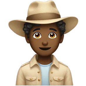 a boy with a yellow face, a smile, a brown hat, a book, and a cloud of thoughts emoji