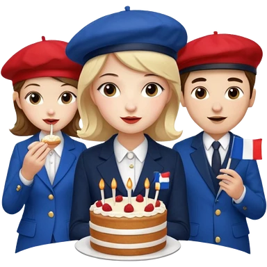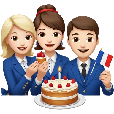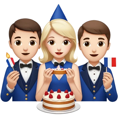a french style elegant girl being recorded by 2 elegant guys with a french flag and the girl eating a cake emoji
