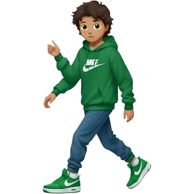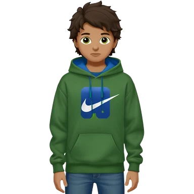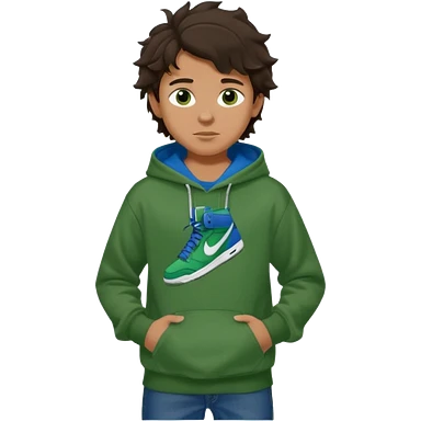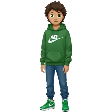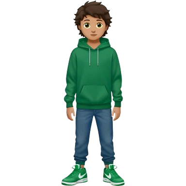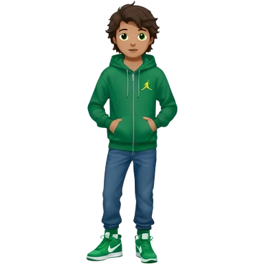 a 14 year old slightly tanned teenage boy with dark brown tousled wavy hair, dark brown eyes wearing a green tshirt, a dark green hoodie, blue jeans and green nike air jordans emoji