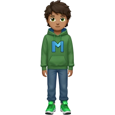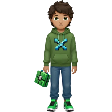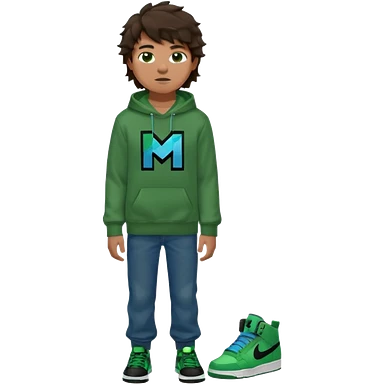 a 14 year old slightly tanned teenage boy with dark brown tousled wavy hair, dark brown eyes wearing a green tshirt, a dark green minecraft hoodie, blue jeans and green nike air jordans emoji