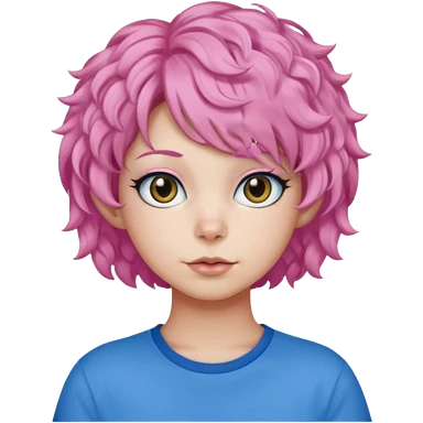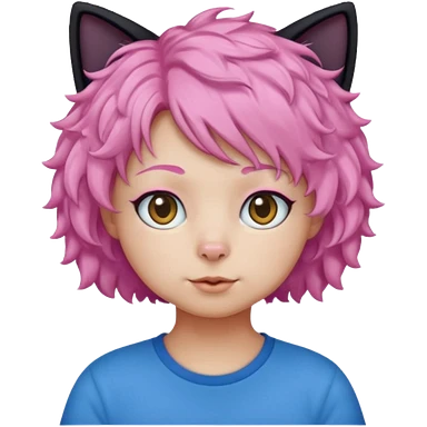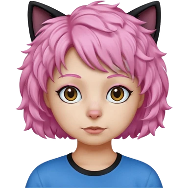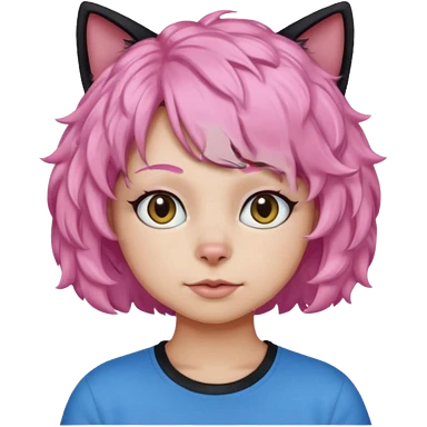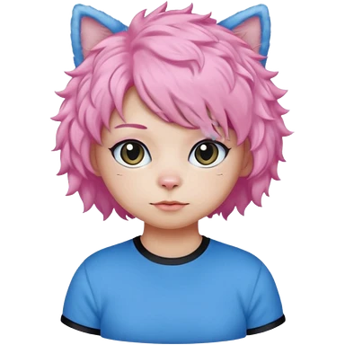 Black cat wearing a short curly pink hair wig, blue T-shirt emoji