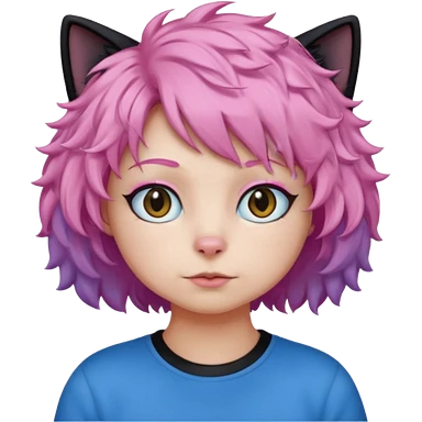 a Black cat wearing a short curly pink hair wig, blue T-shirt emoji