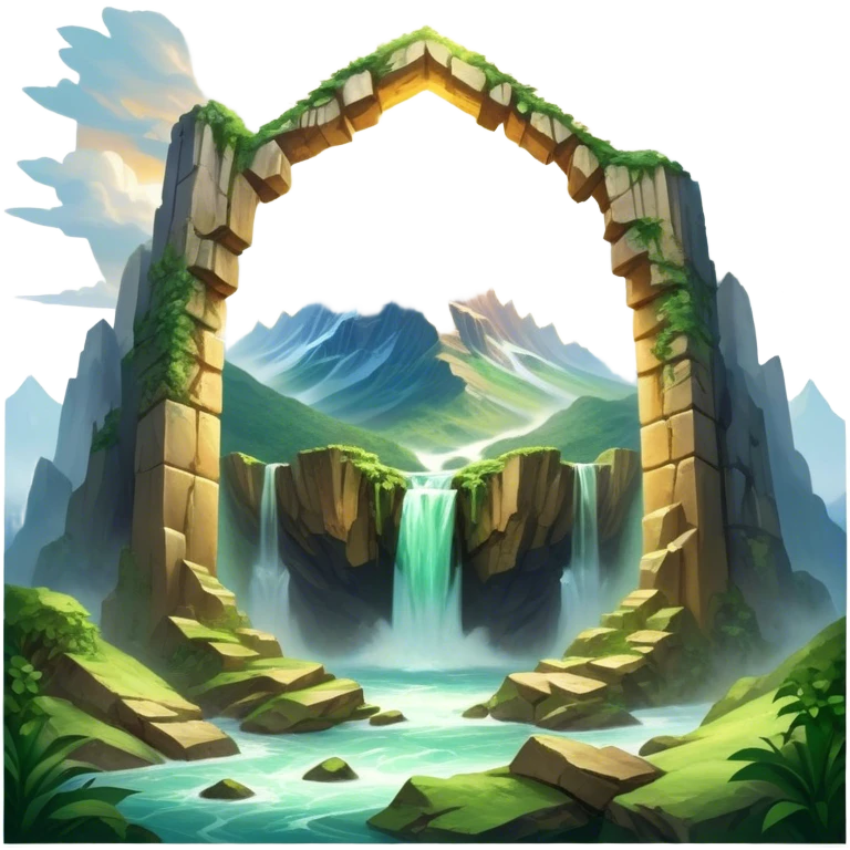 A breathtaking view of a massive mountain split perfectly in half, revealing a glowing mystical core inside. The jagged edges of the split rock are illuminated by a soft golden light emanating from the mountain's heart. The scene is set in a vast landscape with a dramatic sky filled with swirling clouds and beams of sunlight breaking through. Small waterfalls cascade from the edges of the broken mountain, creating a surreal and magical atmosphere. The surrounding environment consists of lush greenery, scattered ancient ruins, and mist rising from the depths of the split.emoji