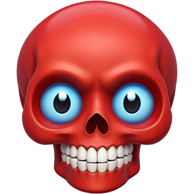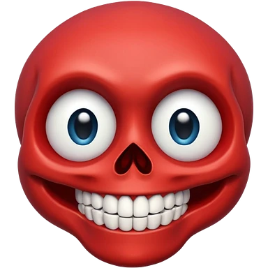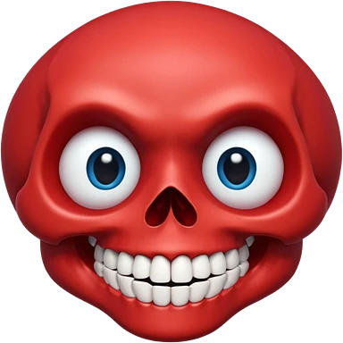 “A bright red cartoon skull with a smooth shiny surface, large round blue eyes with white outlines, a wide exaggerated smile showing big detailed teeth, simple black nose cavity, clean symmetrical face shape, centered on a plain light background, HD, sharp, vibrant, no distortion.” emoji | AI Emoji Generator