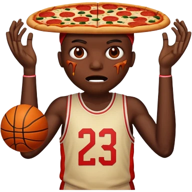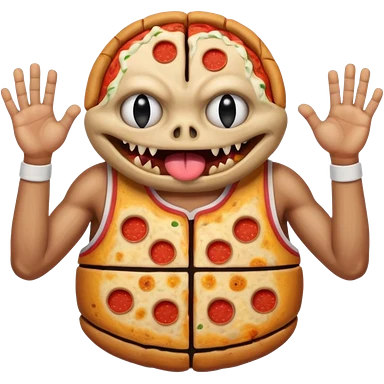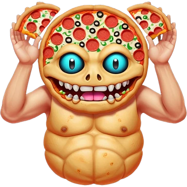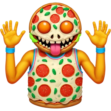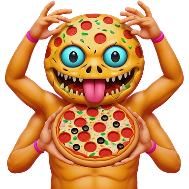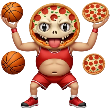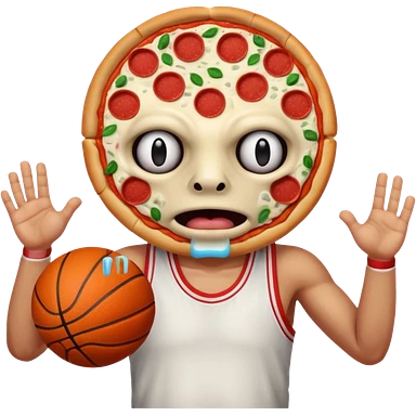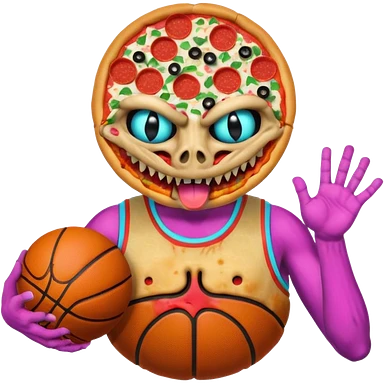 a glitch abomination with hands for a head, a baskeball stomach, pizza eyes emoji