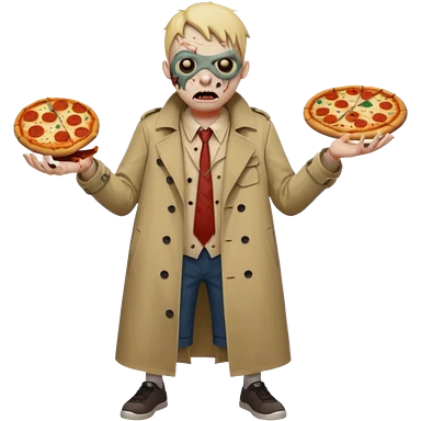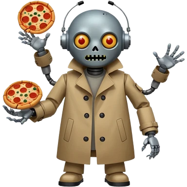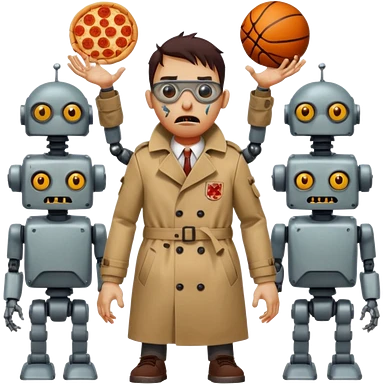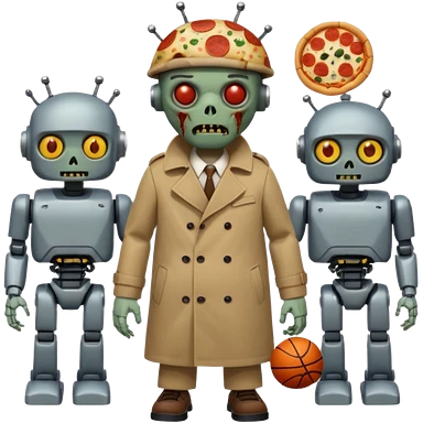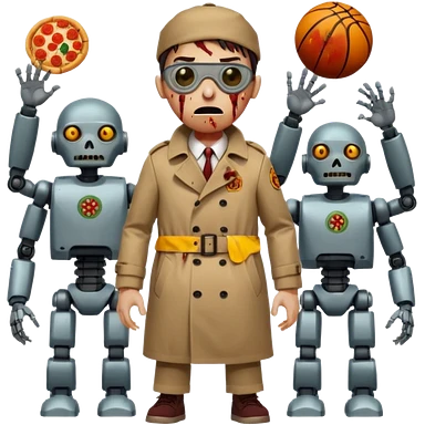 a glitch abomination with hands for a head, a baskeball stomach, pizza eyes, eyepatch, and zombie wounds, wearing trench coat, and robot crowd emoji