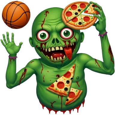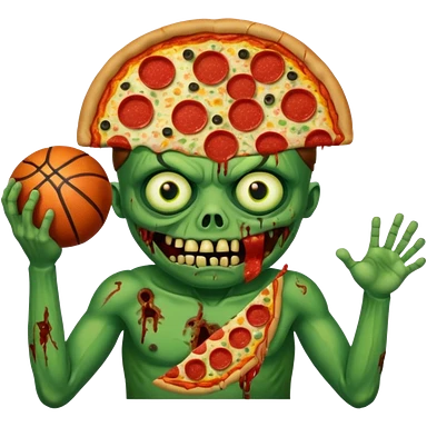 a glitch abomination with hands for a head, a baskeball stomach, pizza eyes, eyepatch, and zombie wounds emoji
