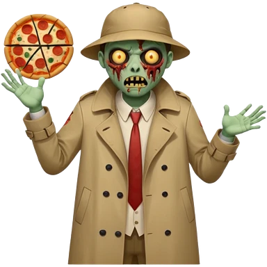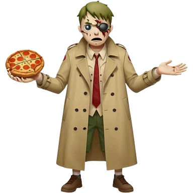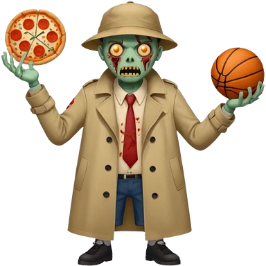 a glitch abomination with hands for a head, a baskeball stomach, pizza eyes, eyepatch, and zombie wounds, wearing trench coat emoji