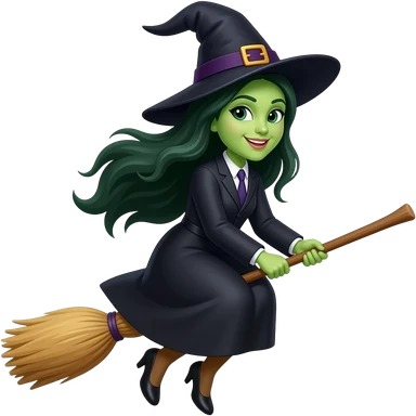 a witch flying on a broomstick, with fair skin and long dark green hair emoji