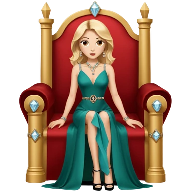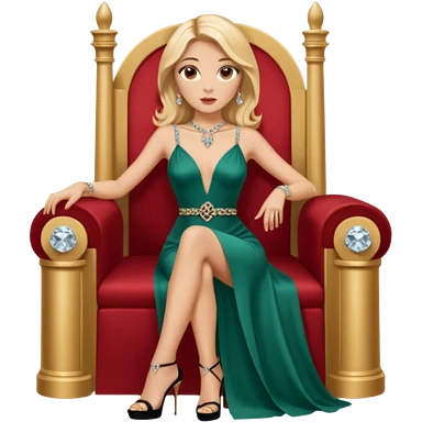 Lilith symbol light brown eyes. Woman of justice and power. Shoulder length blonde haired woman with Gucci, and designer bags next to her. Wearing long elegant dress with slit, sitting on a throne and diamonds everywhere around her. Black Platform high heels on feet. designer bags around her. emoji