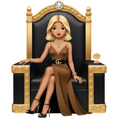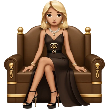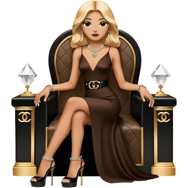 Lilith symbol light brown eyes. Woman of justice and power. Shoulder length blonde haired woman with Gucci and Chanel bags next to her. Wearing long brown and black elegant dress with slit, sitting on a Chanel throne and diamonds everywhere around her. Black Platform high heels on feet. Chanel emoji