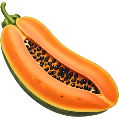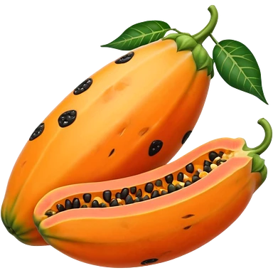 one whole papaya with smooth oval shape and green-yellow skin next to a halved papaya showing vibrant orange flesh and central cluster of small black seeds juicy glossy texture soft lighting subtle shadows emphasizing ripeness no leaf knife or extras transparent background emoji scale emoji