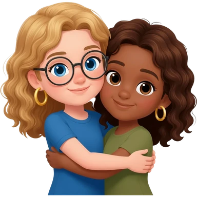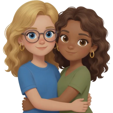 tan girl with blond wavy hair blue eyes no glasses age 10 gold hoop earrings wearing a blue top with an olive skin girl with brown wavy hair no glasses small gold hoop earrings hugging each other emoji