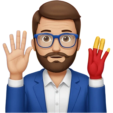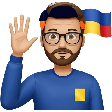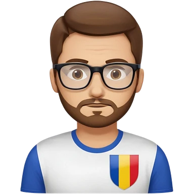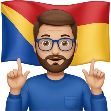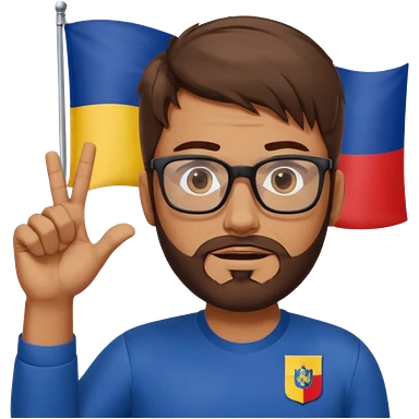 A brown-haired man with a designer stubble beard and rectangle glasses. He shrugs in a "I don't know" gesture, In the background the Romania flag. emoji | AI Emoji Generator